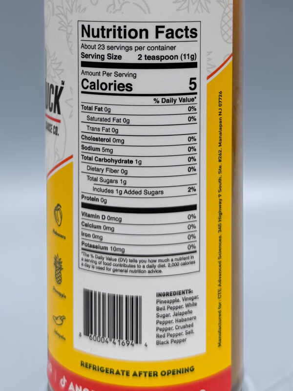 Ingredients: Pineapple, Vinegar, Bell Pepper, Sugar, Jalapeño Pepper, Habanero Pepper, Red Pepper, Salt, Black Pepper
